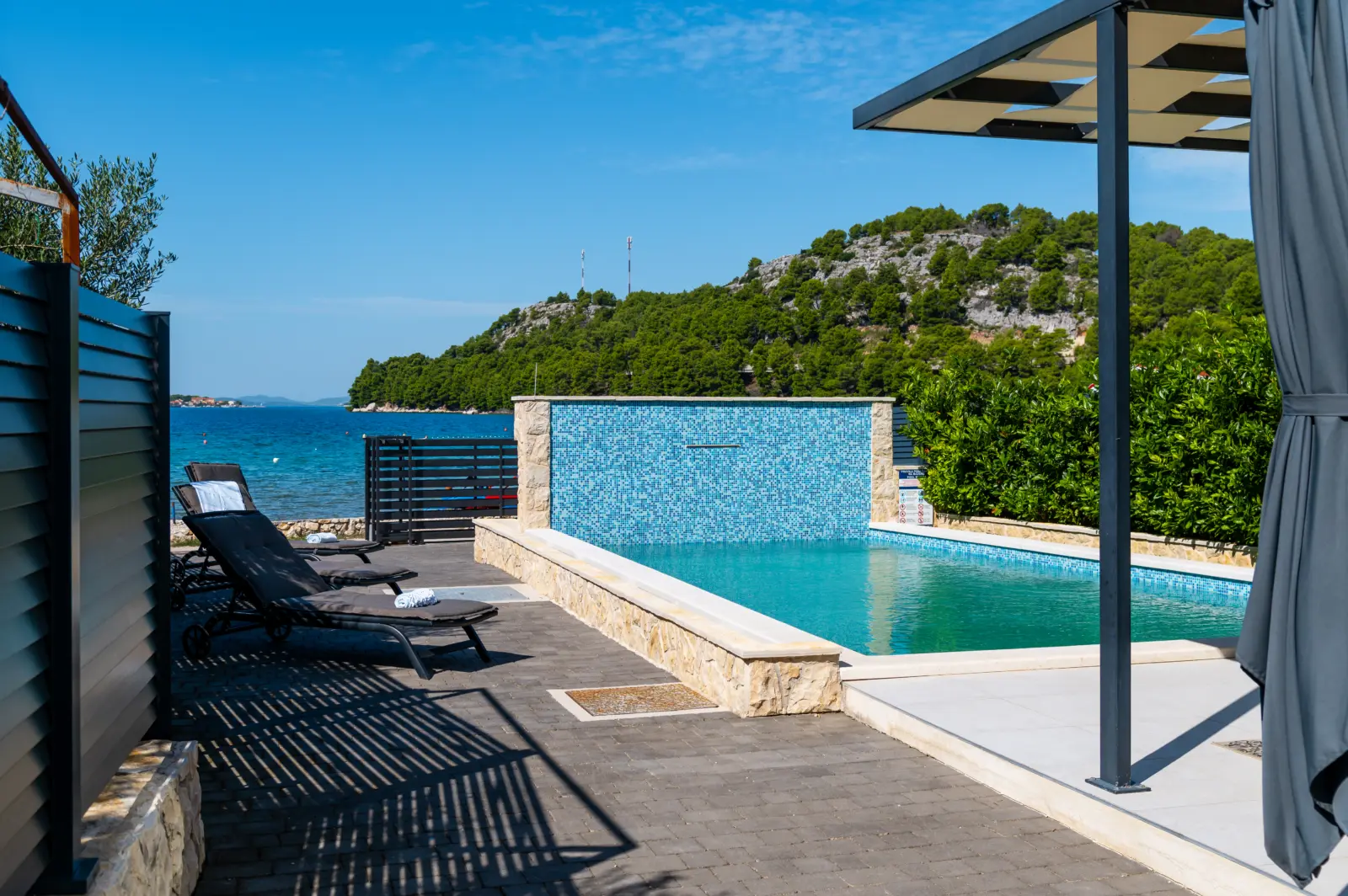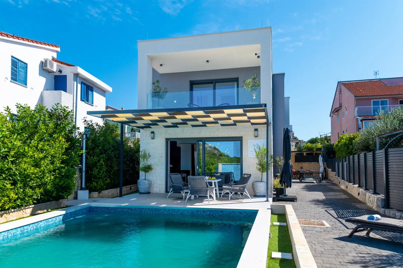 Ich biete Ihnen ein neues Haus an, es sind drei Schlafzimmer vorhanden, jedes Schlafzimmer hat ein Badezimmer mit Toilette und einer Terrasse, mit einem atemberaubendem Sonnenuntergang. Ein Pool ist auch vorhanden, das Sie nutzen können, Ich habe drei Kajaks (zwei Single und ein Doppel) die stehen Ihnen zur Nutzung zur Verfügung. Standup Paddle sind auch vor Ort zur Nutzung. Griller, Outdoorküche und Tischtennis sind auch vorhanden. Für Unternehmensfreudige gibt es genügend Möglichkeiten, ob Sie die Rennräder oder Mountainbikes mitnehmen, da kommen Sie auf Ihren Genuß. Sogar Kletterer können in der Nähe von den Krka Wasserfällen klettern , ca 30 km entfernt. Ein Paradies. Optimal für 6 Personen, Zusatzbetten sind auch vorhanden.