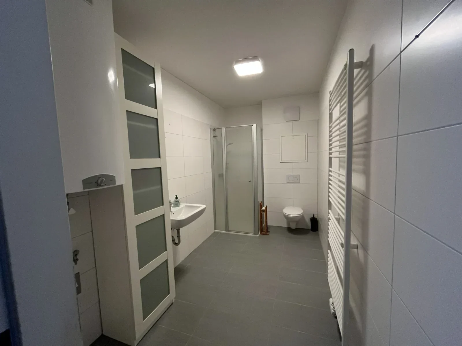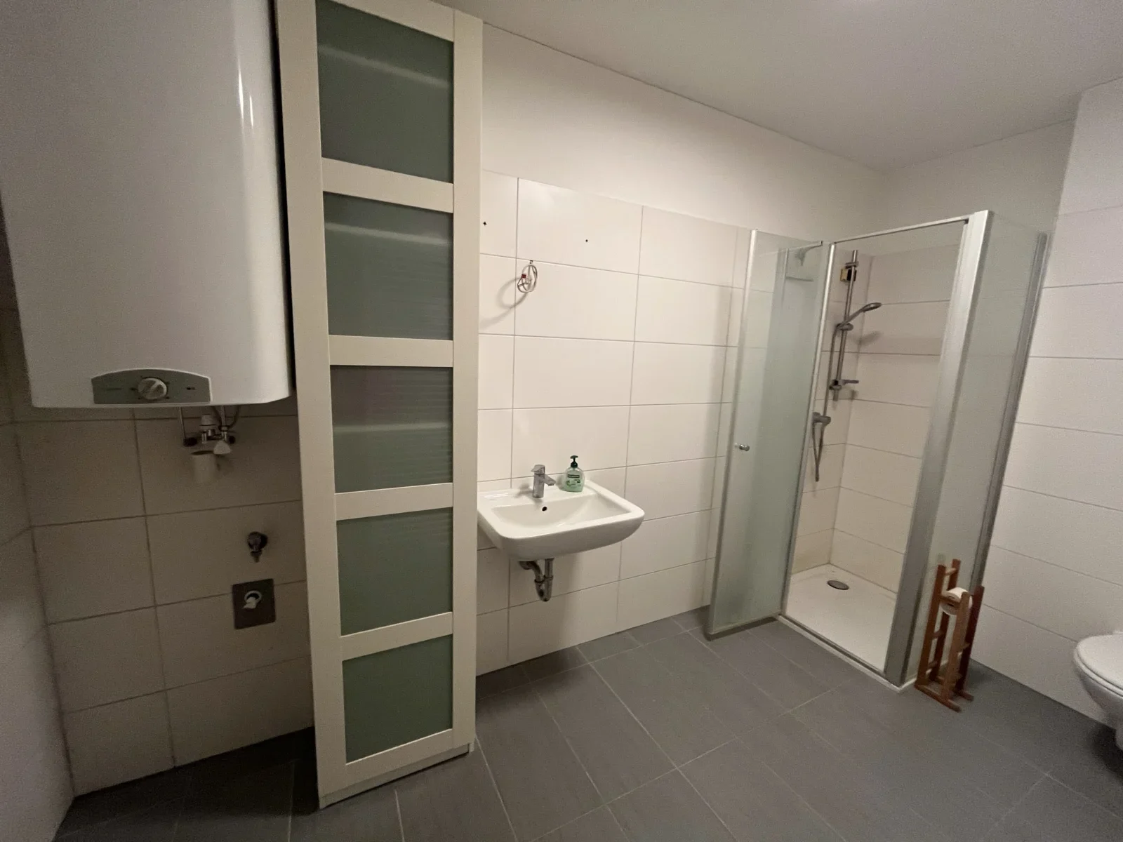 Das moderne Badezimmer ist mit Dusche, WC und Waschmaschinenanschluss ausgestattet.