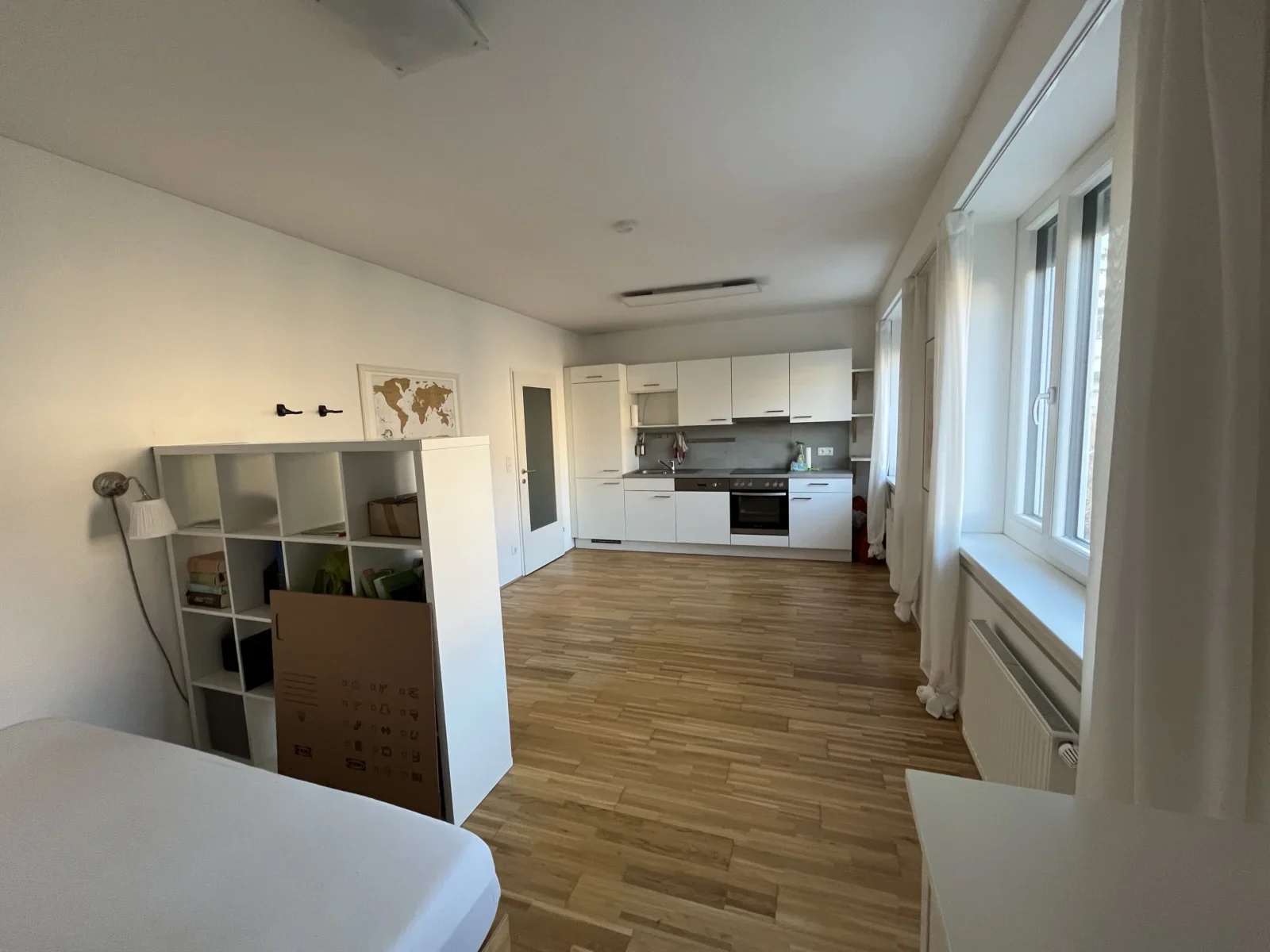 Der helle Wohn- und Schlafraum mit integrierter Küchenzeile bietet alles, was man für komfortables Wohnen benötigt – kompakt, funktional und mit besonderem Flair. Große Fenster sorgen für viel Tageslicht und schaffen eine freundliche, gemütliche Atmosphäre.