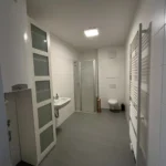 Das moderne Badezimmer ist mit Dusche, WC und Waschmaschinenanschluss ausgestattet.