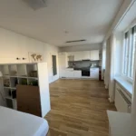 Der helle Wohn- und Schlafraum mit integrierter Küchenzeile bietet alles, was man für komfortables Wohnen benötigt – kompakt, funktional und mit besonderem Flair. Große Fenster sorgen für viel Tageslicht und schaffen eine freundliche, gemütliche Atmosphäre.