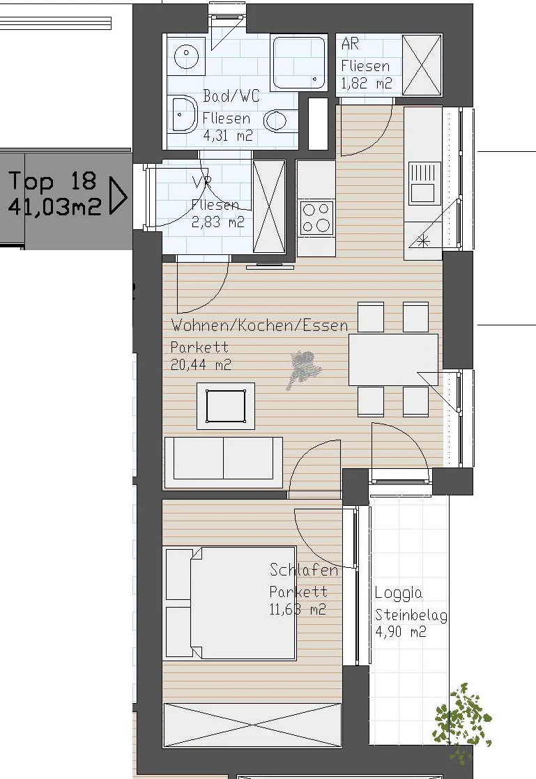Gegenständliche Wohnung hat ein schönes Wohn-Esszimmer mit voll ausgestatteter Küche und Zugang auf den nach Südosten orientierten Balkon. Das Schlafzimmer bietet gut Platz für ein Doppelbett und einen Kasten, das Badezimmer ist mit Dusche und WC ausgestattet und ein Vorraum komplettieren den gut geschnittenen Grundriss.
