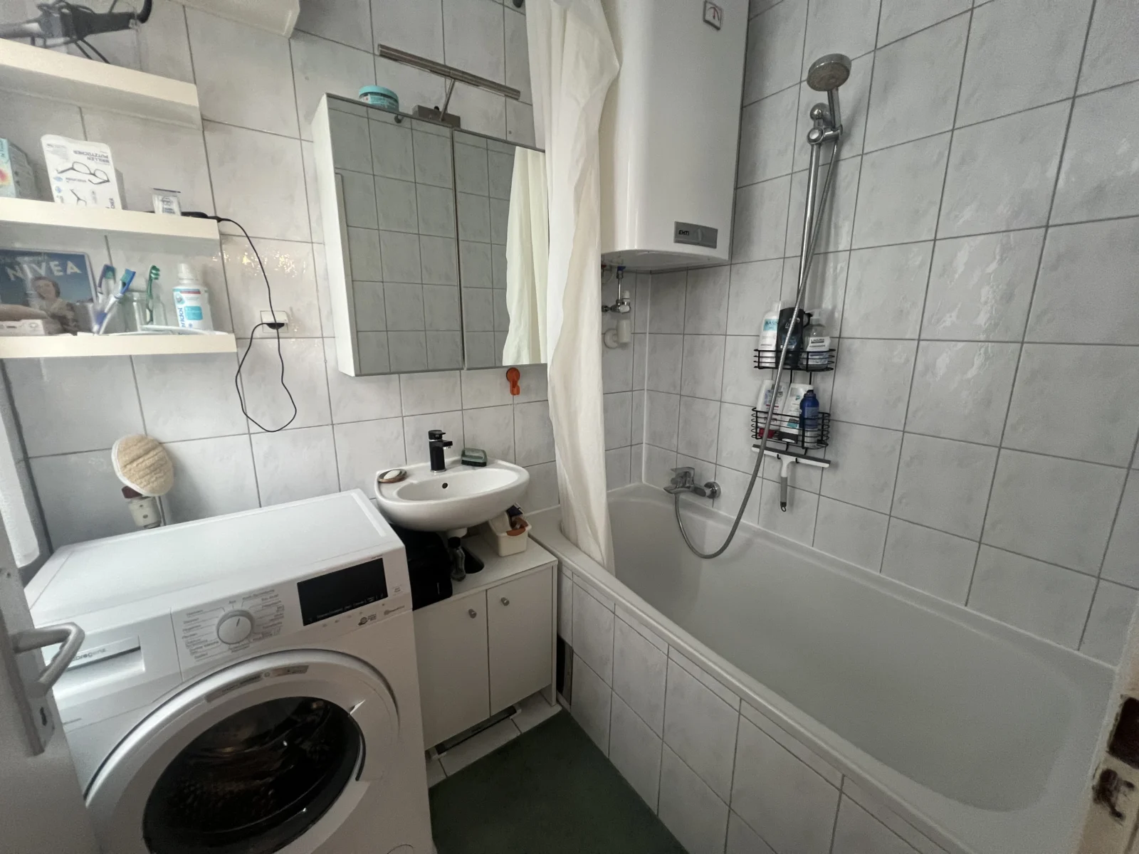 Ein Kellerabteil gehört zur Wohnung, und ein Parkplatz in der Garage ums Eck kann um 90 Euro monatlich angemietet werden.