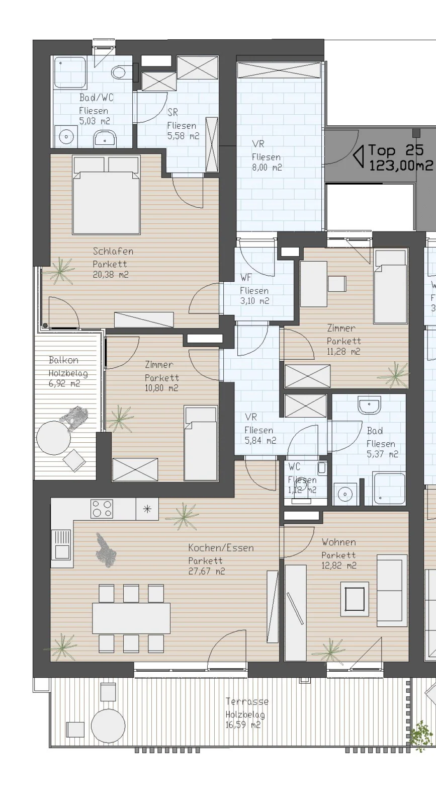 Insgesamt stehen drei weitere Zimmer zur Verfügung, die alle getrennt begehbar sind. Das größte davon ist das ideale Eltern-Schlafzimmer mit eigenem Badezimmer und begehbarem Schrankraum. Zusätzlich bietet es einen Zugang auf den westseitigen Balkon.Ein weiteres modernes Badezimmer mit Dusche und Waschmaschinenanschluss, sowie ein separates Gäste-WC sorgen für hohen Wohnkomfort.